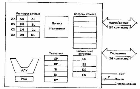 архитектура микропроцессора 8086 представлена на Рис. 7.8. За исключением
