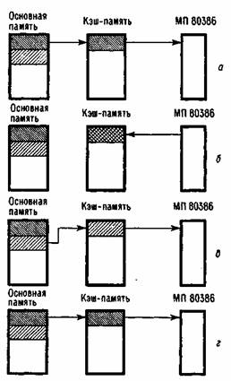 из основной памяти и пересылаются в процессор, б -МП 80386 модифицирует данные и отсылает их для записи, в - позже МП 80386 запрашивает новые данные. Данные в кэш-памяти, помеченные перекрестной штриховкой в п. б, перекрываются новыми данными,